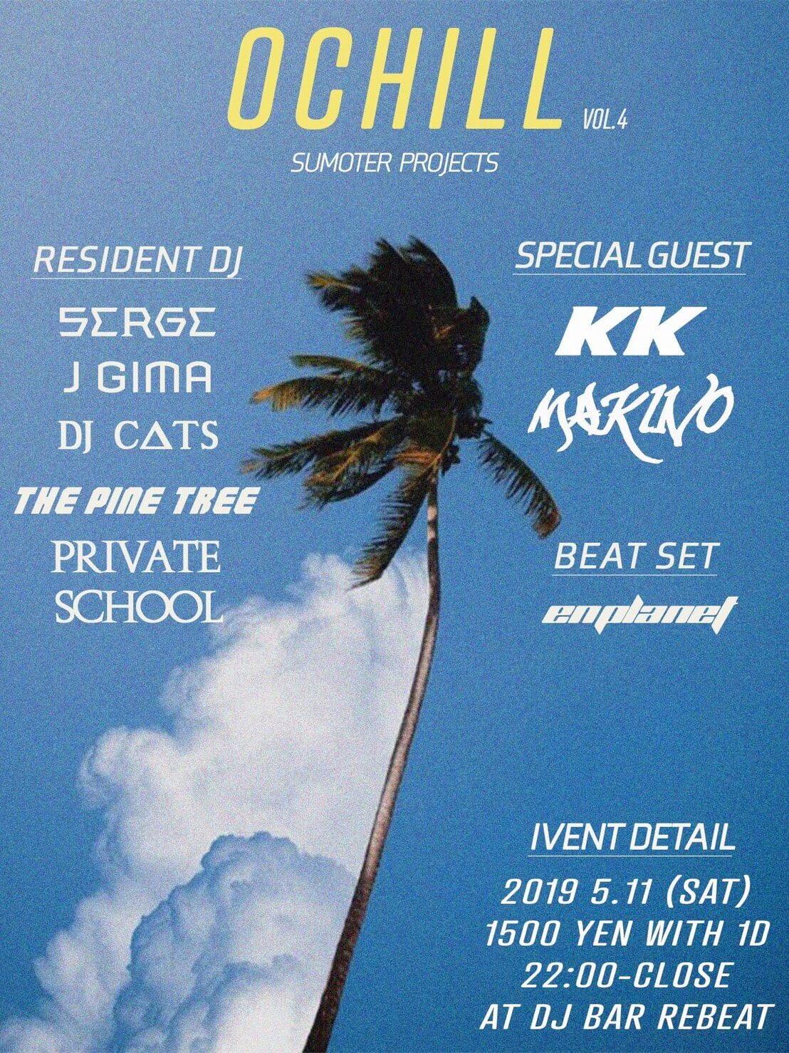 2019.5.11 Sat (END) OCHILL vol.4- Entrance ¥1500 with 1Drink -毎度ハッピーな夜を生み出すOCHILLがラッパーのKKとMakinoをスペシャルゲストに迎え5月11日土曜に開催されます!! 6月頃に沖縄から旅立つPrivate Schoolの送別も兼ねたパーティーです。 ぜひ遊びにお越しください!! Instagram日々のお知らせはこちら