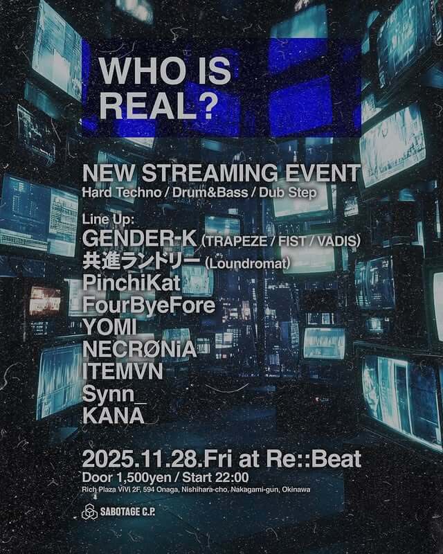 2025.11.28 Fri 22:00 - Last WHO IS REAL?- Entrance ¥1500 -2025.11.28.Friday 『WHO IS REAL?』at RE::BEATDOOR : 1,500yenSTART : 22:00-Genre-HardTechnoDrum&BassDub Step-Line Up-GENDER-K(TRAPEZE / FIST/VADIS) 共進ランドリー(Loundromat)PinchiKatFourByeForeYOMINECRØNiAITEMVNSynn_KANAInstagram日々のお知らせはこちら